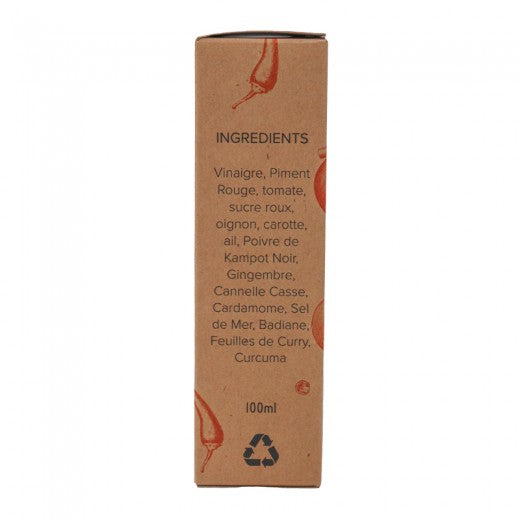Ingredients: Vinegar, Red Chili, tomato, brown sugar, oinion, carrot, garlic, Black Kampot Pepper, Ginger, Cassia Cinnamon, Cardamom, Sea Salt, Star Anise, Curry Leaves, Turmeric