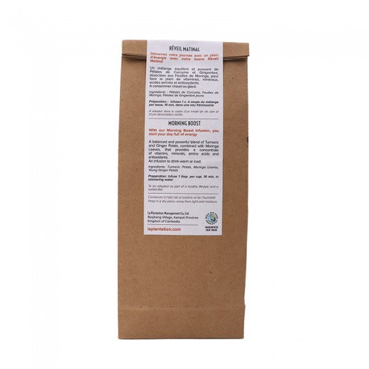 Each plant or leaf of Morning Boost herbal tea is rigorously selected, and dried at low temperature to retain all its aroma and color.